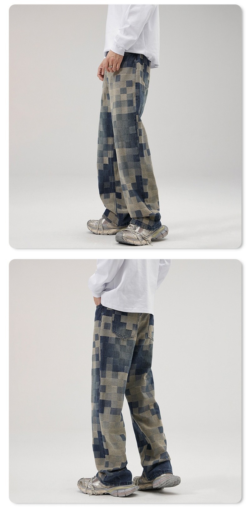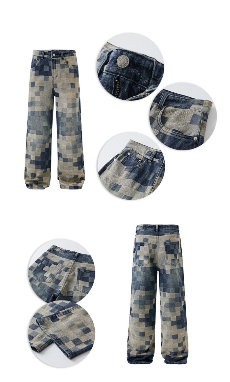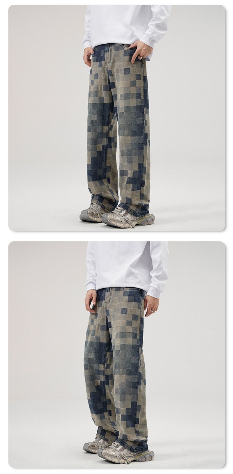 Men's 2025 Mosaic Checkerboard High-Waisted Loose Straight Leg Jeans - American Streetwear, Retro Blue Stretch Denim Pants for Urban Fashion
